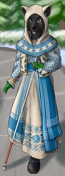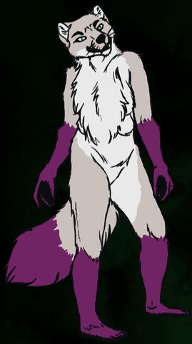 Jadwiga has two coats; in summer, her fur is predominantly silver, with white chest and belly, and Byzantium purple socks (to the knee), gloves (to the elbow), and tailtip (last third of her tail). In winter, she is pure white, with light blue socks, gloves, and tailtip in lieu of summer's purple.